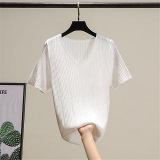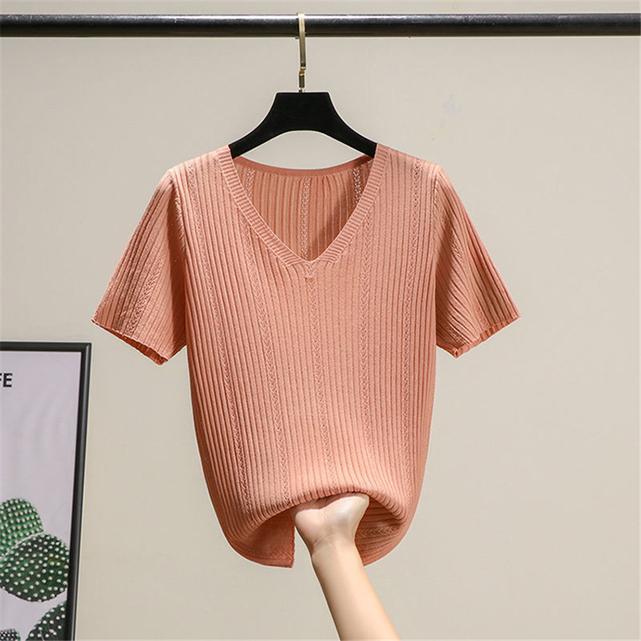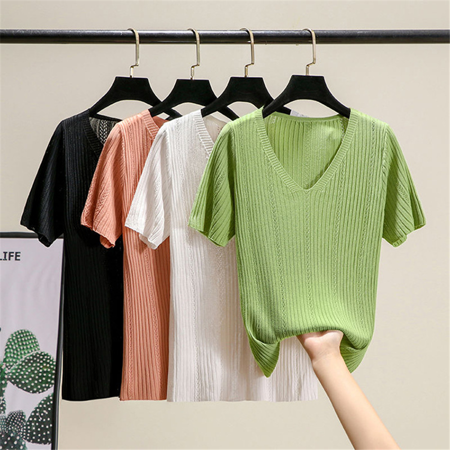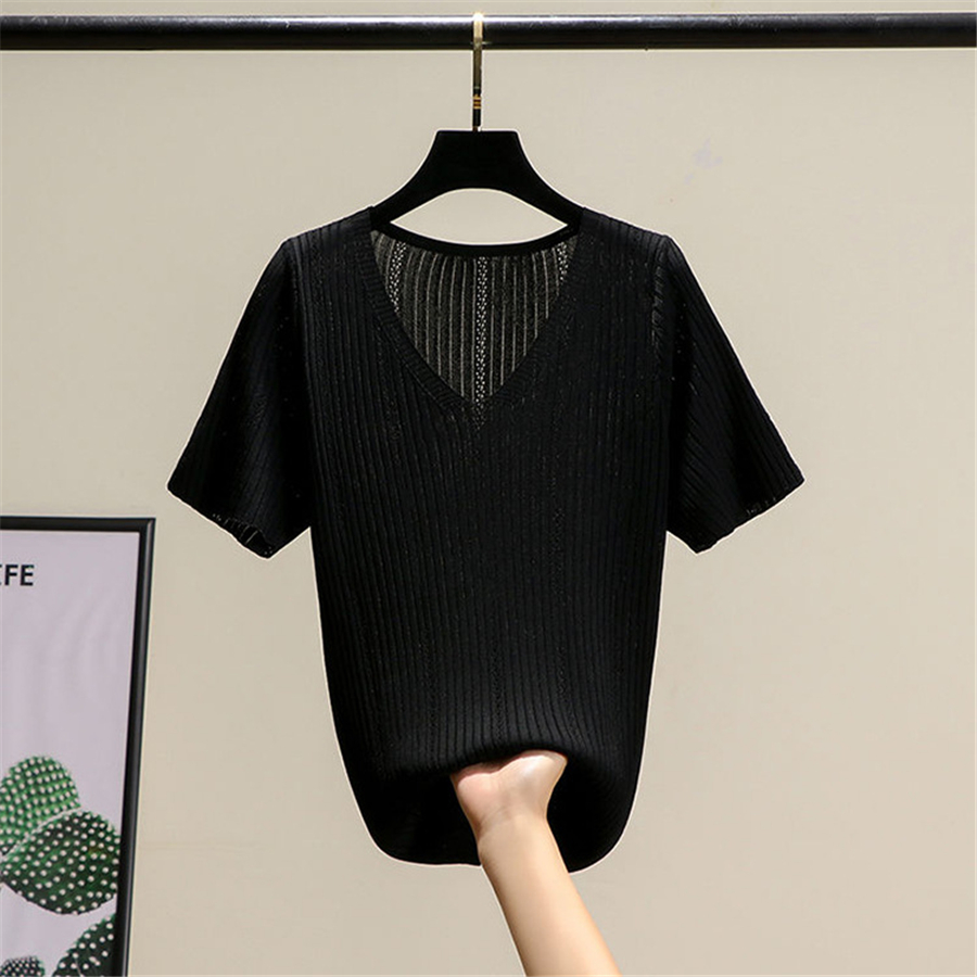 夏季新款冰丝V领透气镂空短袖韩版t恤女装薄针织打底衫内搭上衣潮