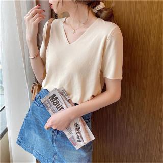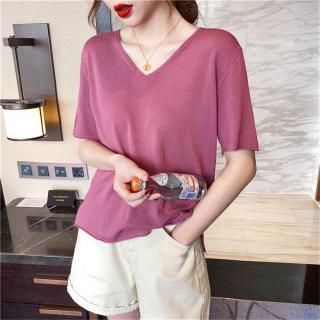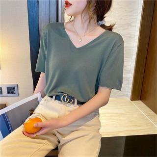 冰丝大码网红短袖t恤打底衫宽松v领针织上衣女ins柔软内搭春夏潮